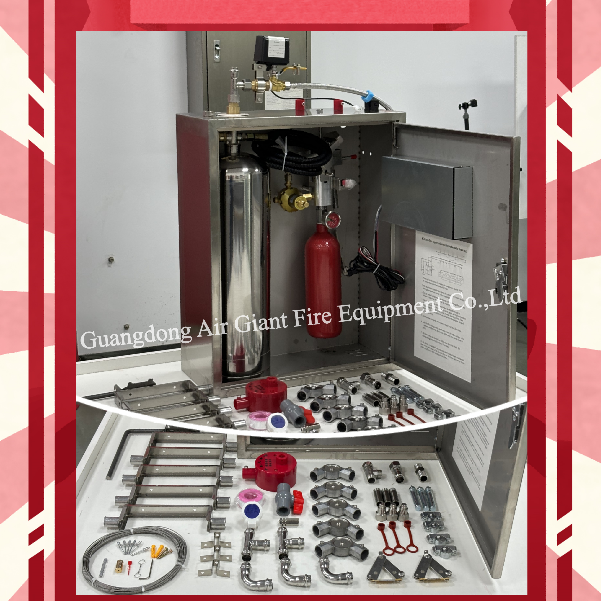 6.মেকানিক্যাল/ইলেকট্রিক কন্ট্রোল ইউনিট: ডিটেক্টর থেকে সংকেত গ্রহণ করে, স্বয়ংক্রিয়ভাবে গ্যাস / শক্তি বন্ধ করে দেয় (একটি সংযুক্ত ভালভের মাধ্যমে), এবং দমনকারী মুক্তি সক্রিয় করে।